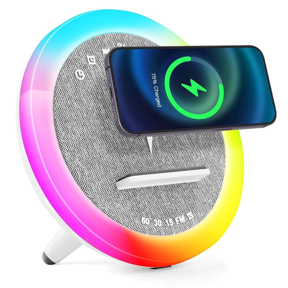 Haut-Parleur et Réveil LED d’Ambiance avec Chargeur Sans Fil 15W