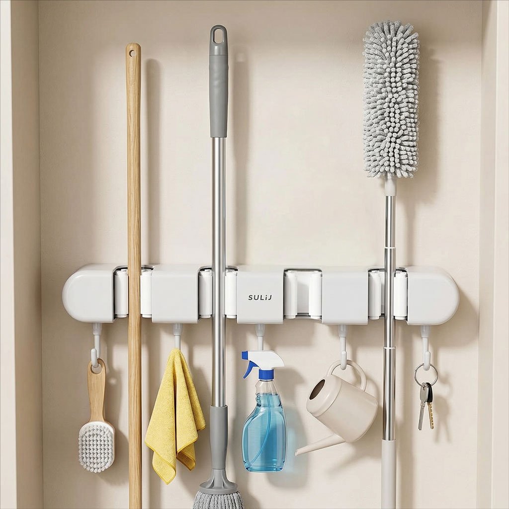 هيكل من البلاستيك الصلب (ABS): مادة قوية جداً ومقاومة للصدمات والرطوبة، مما يضمن عدم تآكله أو تغير لونه بمرور الوقت، خاصة في الأماكن الرطبة كالحمامات.مقابض سيليكون ذكية: نظام المشابك (Clips) مزود بمطاط مرن يمسك مقابض الأدوات بإحكام شديد بفضل الجاذبية؛ كلما كان الغرض أثقل، زادت قوة الإمساك به.سعة تخزين 9 في 1: مزود بـ 4 مقابض آلية للمكنسات و 5 خطافات عملية قابلة للطي لتعليق الفوط، المفاتيح، أو أدوات المطبخ الصغيرة.تصميم موفر للمساحة: بفضل لونه الهادئ وتصميمه المدمج، يختفي خلف الأبواب أو في زوايا المطابخ ليحول الفوضى إلى ترتيب أنيق في ثوانٍ.مقاومة تامة للمياه: على عكس المعادن العادية، هذا المنظم البلاستيكي لا يصدأ أبداً، مما يجعله الخيار الأول لتنظيم أدوات الحمام أو المرآب الرطب.تركيب سهل وسريع: يأتي مع خيارات تثبيت قوية تضمن استقراره على الجدران الملساء لفترات طويلة.المواصفات التقنية:المادة: بلاستيك ABS صلب عالي الجودة + سيليكون.التكوين: 4 مقابض للتعليق + 5 خطافات عملية.الاستخدام: داخلي (مطبخ، حمام، مستودع).الميزة: خفيف الوزن، مضاد للصدأ، ونظام إمساك أوتوماتيكي.