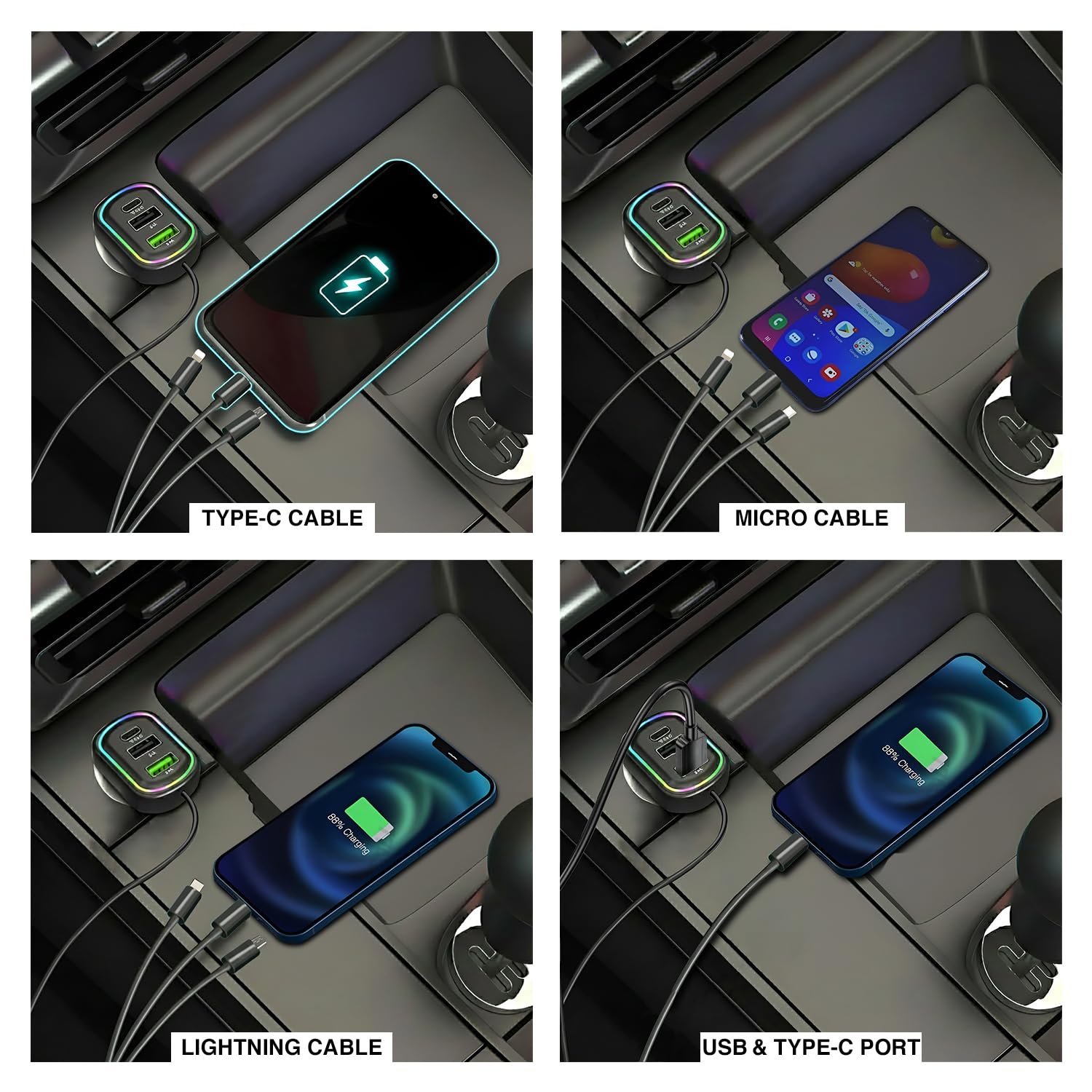 ثلاثي المنافذ “هاي-سبيد”: يحتوي على منفذ Type-C (PD) فائق السرعة ومنفذين USB-A بقوة 3.1 أمبير لكل منهما، مما يتيح شحن 3 أجهزة (هاتف، تابلت، وكاميرا سيارة) في نفس الوقت دون ضعف في الأداء.قوة جبارة 48 واط: بفضل تكنولوجيا الشحن الذكي، يوفر طاقة إجمالية تصل إلى 48W، مما يجعله متوافقاً تماماً مع أحدث أجهزة iPhone 17 وسلسلة Samsung Galaxy الحديثة.كابل 3-في-1 “يونيفرسال”: يأتي مجاناً مع كابل متعدد الرؤوس (Lightning للمؤيفون، USB-C للأجهزة الحديثة، وMicro-USB للأجهزة التقليدية)، ليكون الحل الشامل لكل أفراد العائلة.إضاءة RGB الذكية: حلقة إضاءة LED متغيرة الألوان تضيف جواً حيوياً للسيارة وتساعدك على توصيل الأسلاك ليلاً بلمح البصر دون تشتيت انتباهك عن الطريق.توافق مطلق “فولت-ماكس”: يعمل بكفاءة على نظام 12V (السيارات الصغيرة والـ SUV) ونظام 24V (الشاحنات الكبيرة والمقطورات)، مما يجعله قطعة لا غنى عنها لأي سائق.حماية “سيف-تشارج”: مزود بخصائص أمان متقدمة ضد الحرارة الزائدة، الشحن الزائد، والتماس الكهربائي، لحماية بطارية هاتفك الغالية.المواصفات التقنية:إجمالي الطاقة: 48 واط (48W).المنافذ: 1x Type-C PD + 2x USB-A (3.1A).التقنيات المدعومة: Power Delivery (PD) & Quick Charge (QC).الإضاءة: LED RGB متغيرة الألوان.الكابل المدرج: 3 في 1 (Lightning, Type-C, Micro-USB).الجهد: متوافق مع 12 فولت و 24 فولت.تفاصيل المنتج