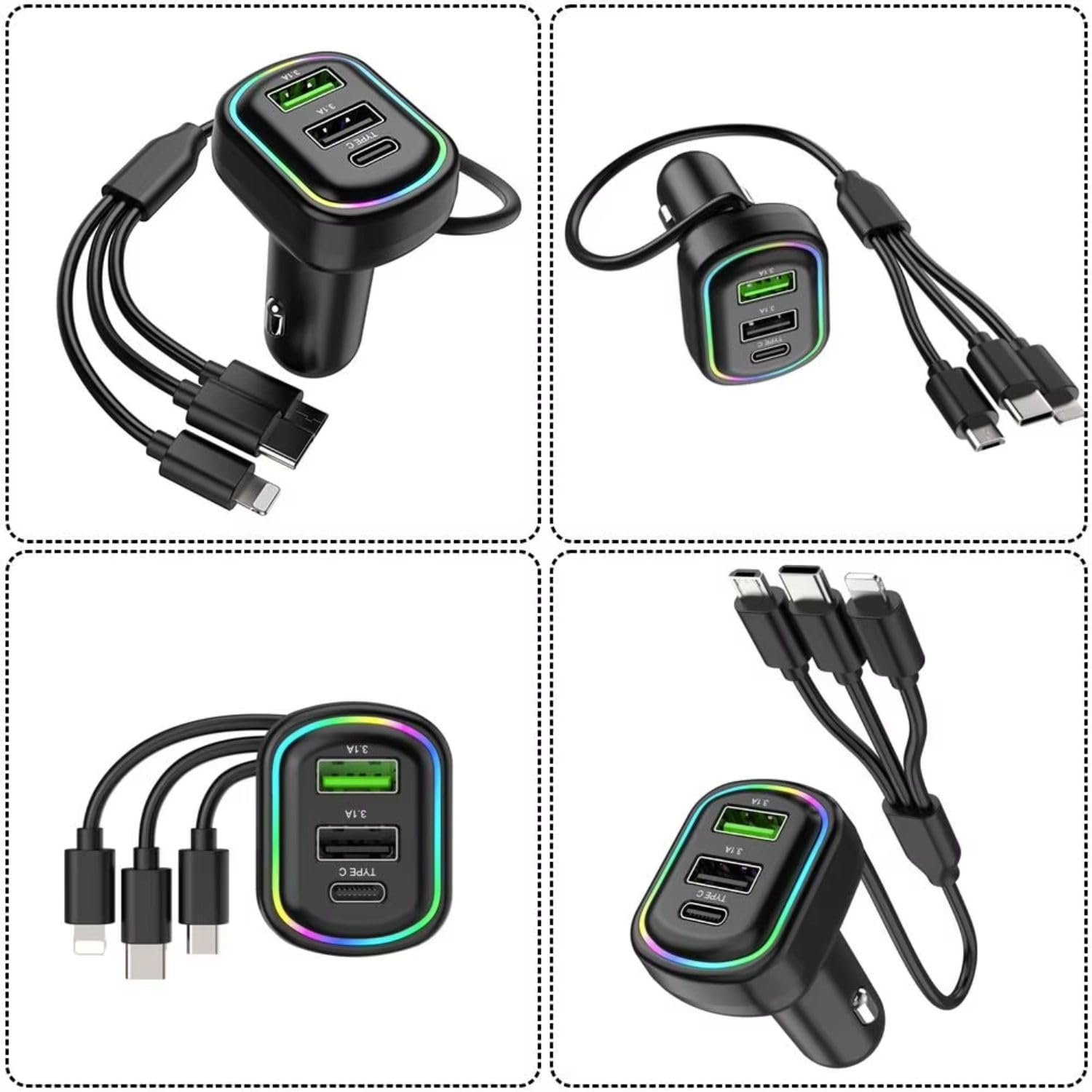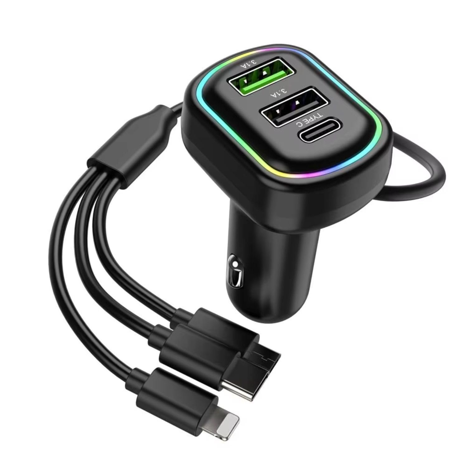 Chargeur de voiture à 3 ports avec câble de charge 3 en 1 intégré (Lightning/Type-C/Micro USB) – شاحن سيارة