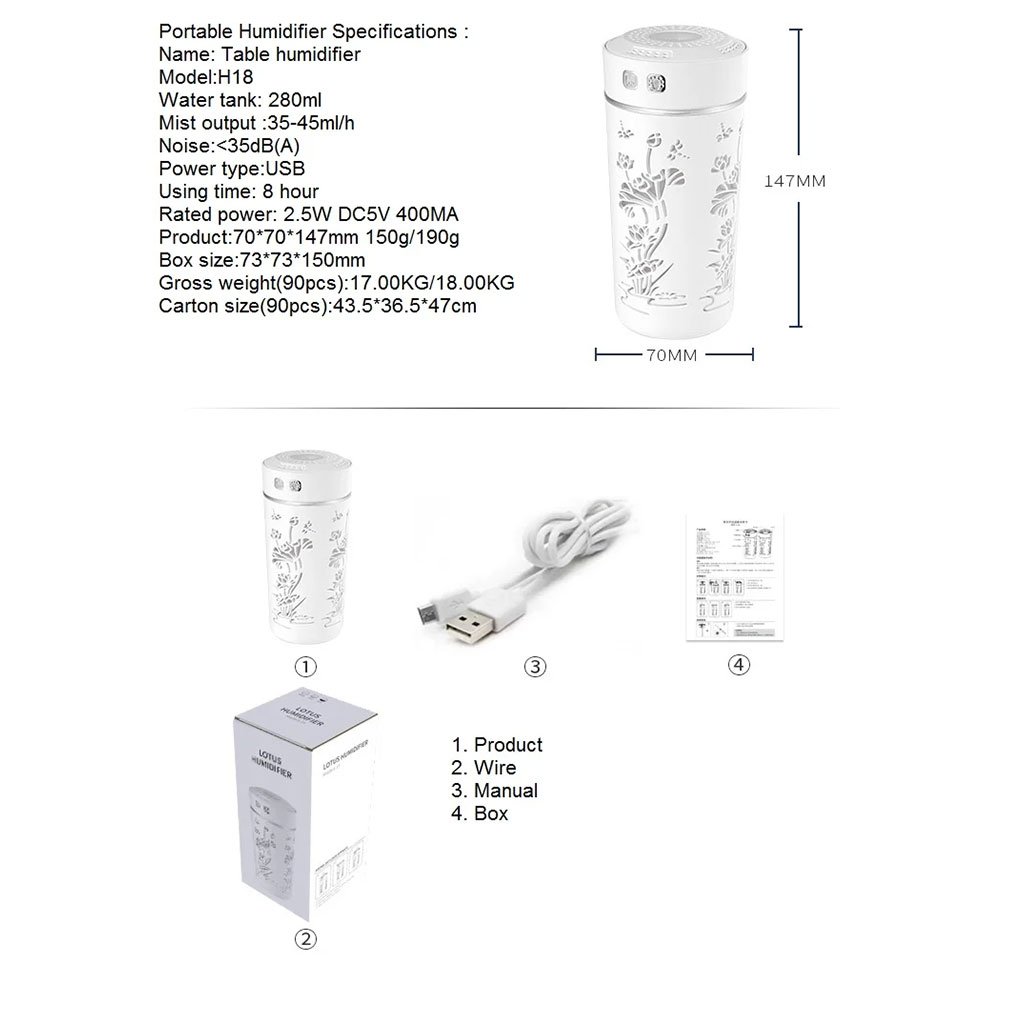 Diffuseur d’huiles essentielles et d’arôme froid, humidificateur d’air mécanique USB de 260ML à buse unique pour la maison USB humidificateur d’air mécanique ménage 260ML buse unique arôme froid diffuseur couleur lumière huiles essentielles diffuseur Hydratant et humidifiant silencieux, accompagnant sans déranger Hydrate en profondeur et élimine la sécheresse La brume délicate et importante laisse la peau humide et éclatante Convient pour différentes occasions, hydratant différents espaces Humidification intelligente, arrêt automatique de 6-12 heures Lumière douce veilleuse chaude vaporisateur délicat et doux Matériel: ABS + pp + composants électroniques Couleur: blanc/bleu/rose Contenu de l’emballage:1 x humidificateur1 x câble de chargement usb1 x manuel chinois et anglais Seul le contenu de l’emballage ci-dessus
