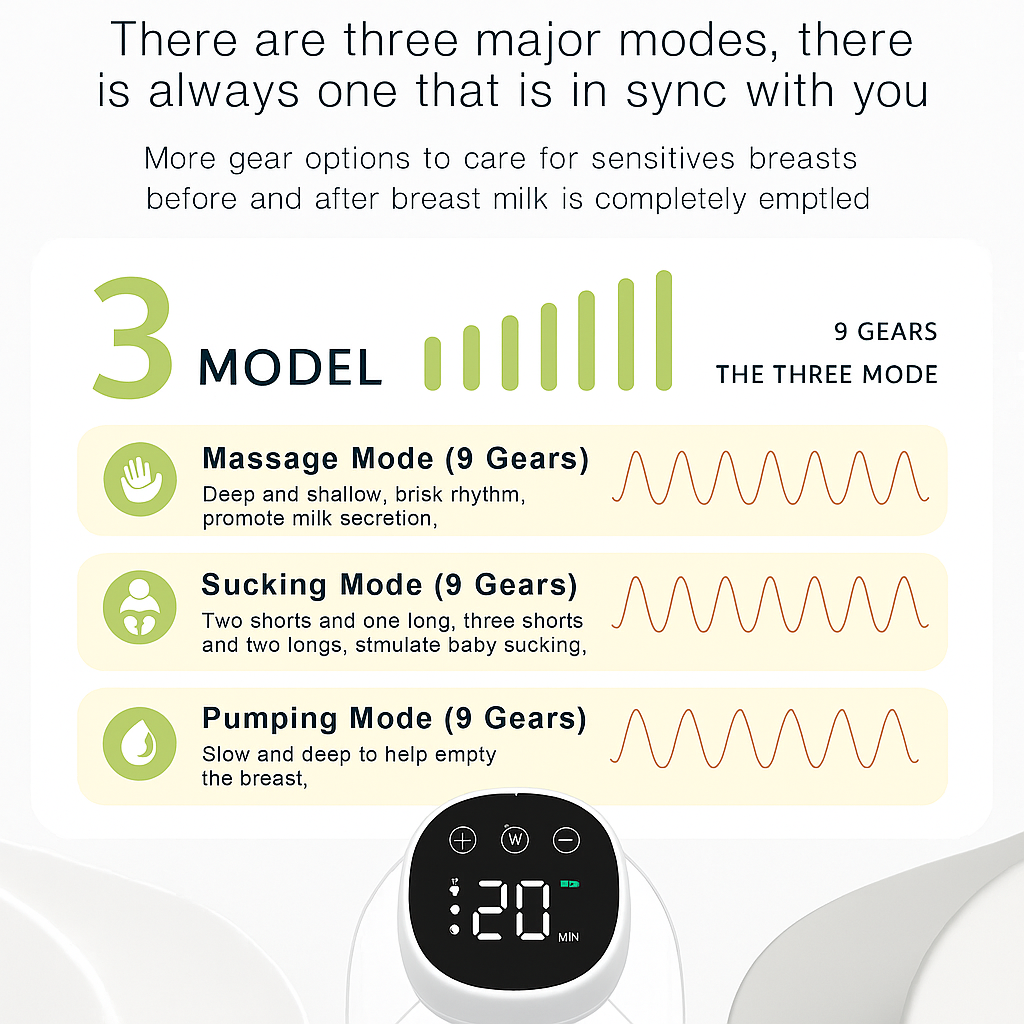 تصميم “هاندز-فري” (Hands-Free): مضخة لاسلكية بالكامل توضع داخل حمالة الصدر، مما يمنحكِ يدين حرتين للقيام بمهامكِ الأخرى بخصوصية مطلقة.محرك “ألترا-سايلنت” (Quiet Motor): تقنية خفض الضجيج المتقدمة تضمن لكِ عملية ضخ هادئة جداً، لا تسبب أي إحراج في الأماكن العامة ولا تزعج طفلكِ النائم.راحة السيليكون الناعم (Comfort Fit): وسادة تدليك من السيليكون الطبي المرن تتوافق مع شكل الثدي وتوفر شفطاً طبيعياً ومريحاً يمنع تهيج البشرة الحساسة.نظام حماية شامل (Anti-Leak): تصميم مطور يمنع تسرب الحليب تماماً ويضمن بقاء الجهاز والملابس نظيفة، مع نظام مغلق لضمان أعلى معايير النظافة.بطارية قوية وشحن USB: مزودة ببطارية ليثيوم قابلة لإعادة الشحن توفر ساعات طويلة من الاستخدام، ويمكن شحنها بسهولة عبر أي منفذ USB (لابتوب، شاحن سيارة، أو باور بانك).سهولة التفكيك والتنظيف: أجزاء قابلة للفصل بسهولة، مما يجعل عملية التعقيم والتنظيف اليومية سريعة وبسيطة ولا تأخذ من وقتكِ الكثير.خفة الوزن والقابلية للنقل: حجم صغير جداً يجعلها الرفيق المثالي في حقيبة اليد أثناء السفر أو الذهاب للعمل.المواصفات التقنية:الموديل: MY-376.النوع: مضخة ثدي كهربائية أحادية (Single) قابلة للارتداء.طريقة الشحن: كابل USB (Rechargeable).المادة: بلاستيك ABS + سيليكون طبي (BPA Free).الميزة: محرك هادئ، حماية ضد التسرب، تصميم مريح.
