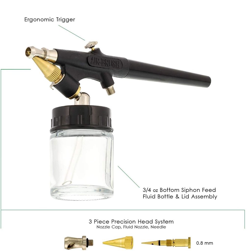 • Comprend : bouteilles de fluide d’alimentation par siphon de 3/4 oz, tuyau tressé de 1/8 po, tuyau en plastique de 5 pi, régulateur de propulseur
