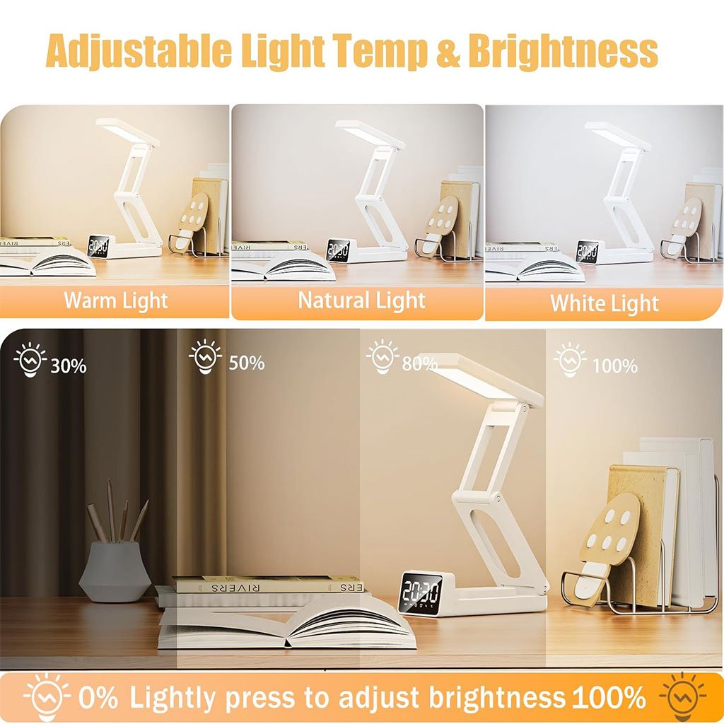 Lampe de bureau rechargeable sans fil avec réveil LED et power bank 10 000 mAh – مصباح مكتب ومصباح مع شاحن متنقل