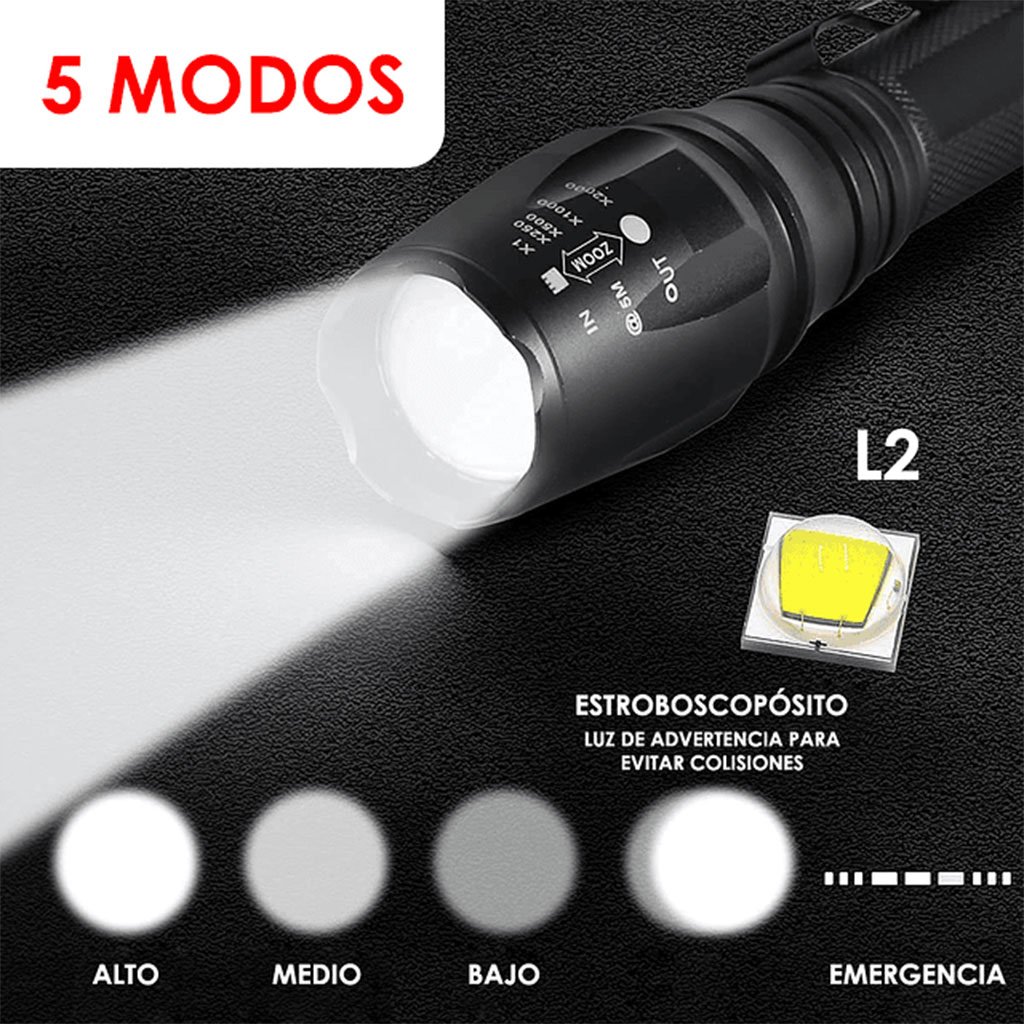 • 5 modes d’éclairage et 5 modes de zoom : cette lampe de poche tactique Swat super lumineuse dispose de cinq modes d’éclairage ; Haut, moyen, bas, stroboscopique et urgence. Ses 5 fonctions de zoom (X1 – X250 – X500 – X1 000 – X2 000) permettent à la lampe de poche d’éclairer non seulement les espaces proches, mais également les espaces éloignés.