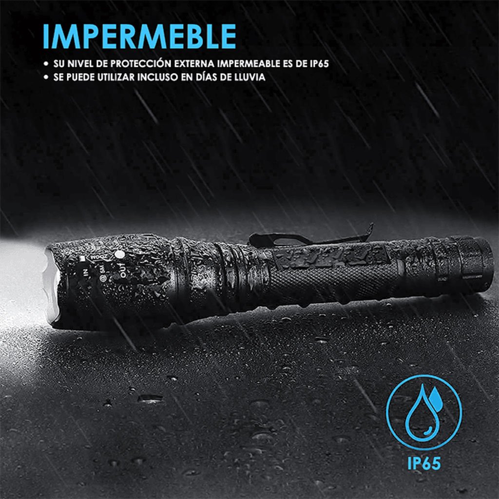 • Étanchéité IP65 : cette lampe de poche tactique est étanche avec un indice IP65 et peut résister aux conditions météorologiques les plus extrêmes telles que les tempêtes et les fortes pluies. Grâce à ces caractéristiques, il est idéal pour le camping et les activités de plein air.