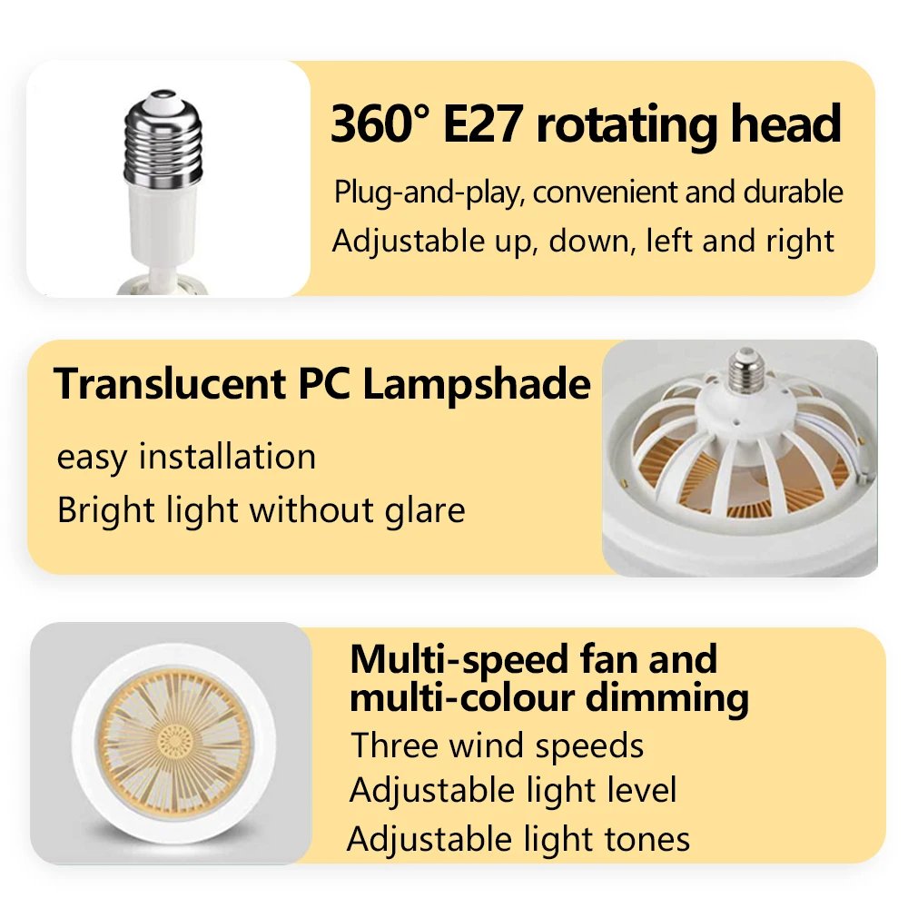 - Ventilateur de plafond avec lumières. L’installation est aussi simple que l’installation d’une ampoule E27.