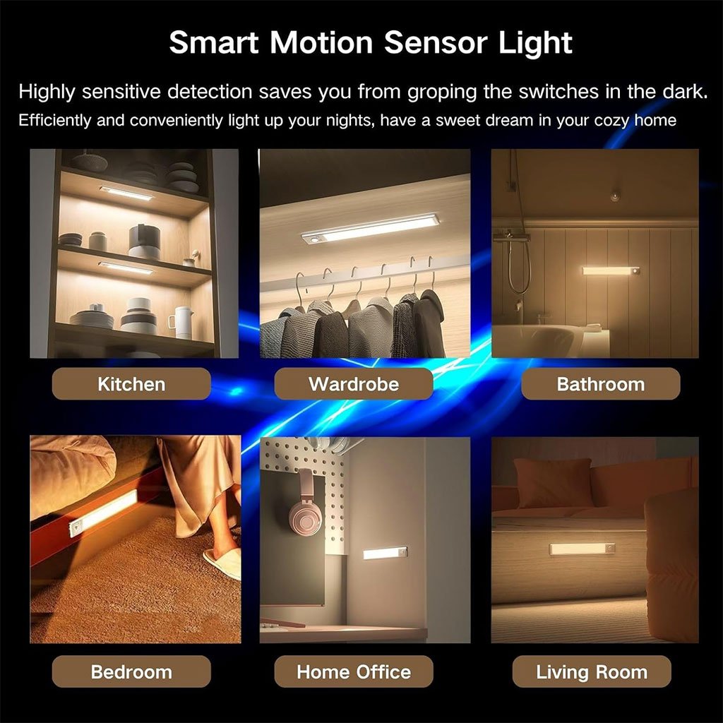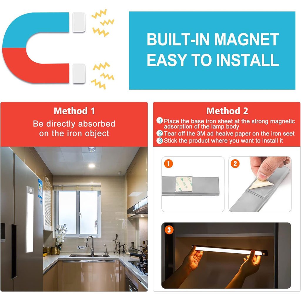- 【Easy Installation】Grâce aux puissants aimants incorporés aux deux extrémités, il peut être fixé à n’importe quelle surface en fer. Vous pouvez également utiliser la feuille de fer incluse pour le fixer à toute surface non ferreuse. Les lampes à détecteur de mouvement d’intérieur conviennent à la cuisine, à l’armoire, à la garde-robe, à la chambre à coucher, à la salle de bain, à l’étagère, au garage, au couloir, aux escaliers, etc.
