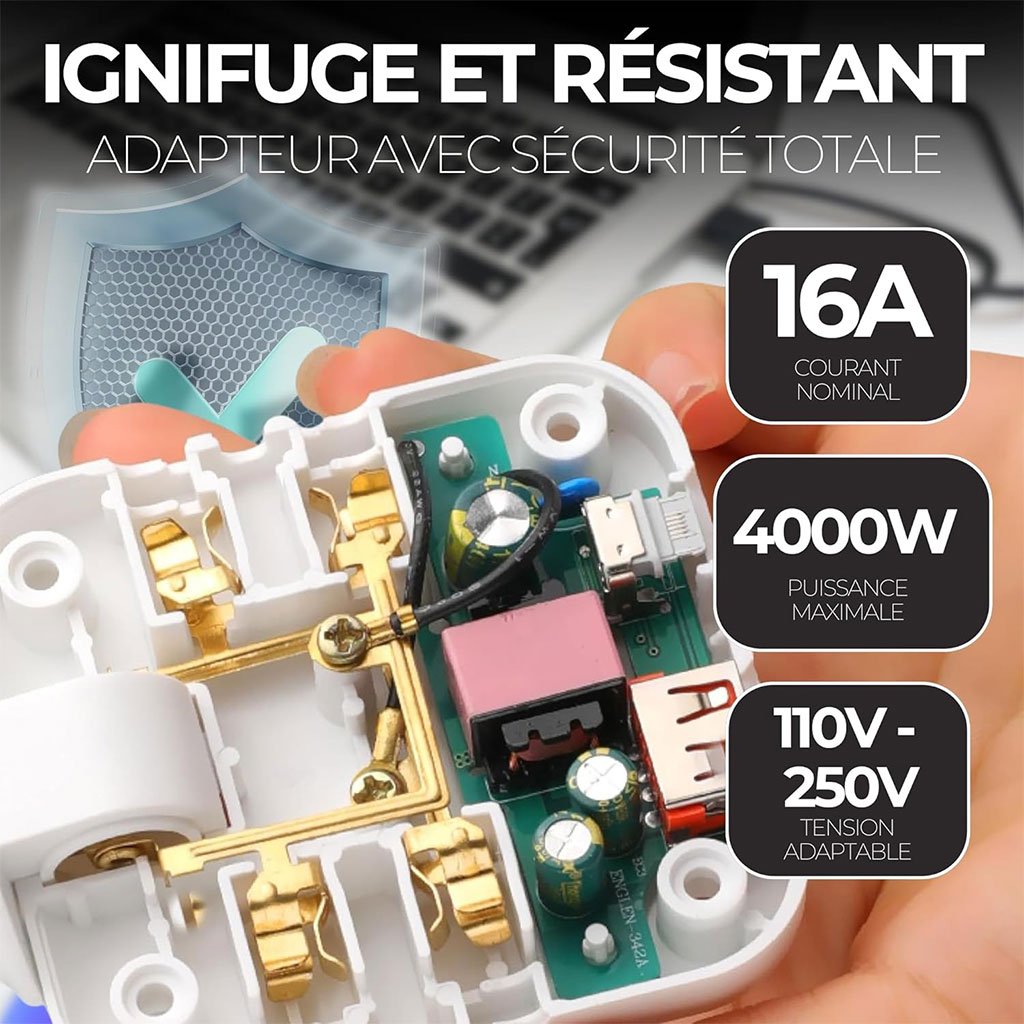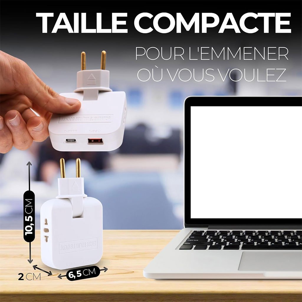 •  ADAPTATEUR COMPACT : 10,5 CM x 6,5 CM Emportez le confort partout avec notre adaptateur multiprise, doté de 2 ports USB et de 2 prises supplémentaires. Sa taille compacte, avec des dimensions de 10,5 cm x 6,5 cm, le rend idéal pour être transporté facilement dans votre sac à main, sac à dos ou valise.
