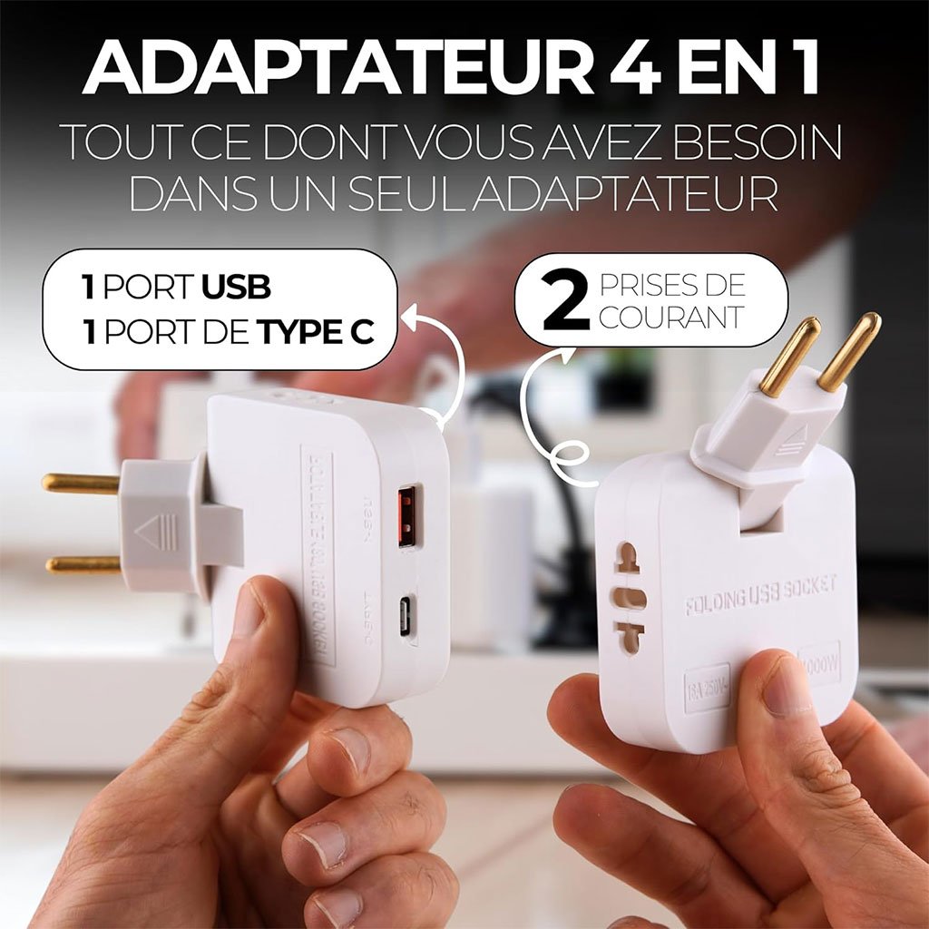 •  ADAPTATEUR 4 EN 1 – MAXIMUM D’EFFICACITÉ DANS UNE SEULE PRISE: Cet adaptateur multiprise comprend 1 port USB, 1 port USB de type C et 2 prises électriques, offrant la fonctionnalité d’une prise murale plate dans un design compact. Idéal comme prise plate derrière meuble, il permet de brancher jusqu’à 4 appareils sans prendre d’espace supplémentaire. Parfait pour ceux qui ont besoin d’une multiprise plate derrière meuble ou d’une prise de courant avec USB.