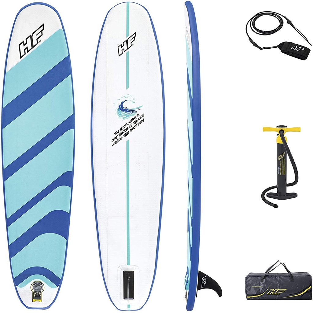 - Contenu : Planche de surf, pompe à main, sac de transport, leash de surf, kit de réparation.