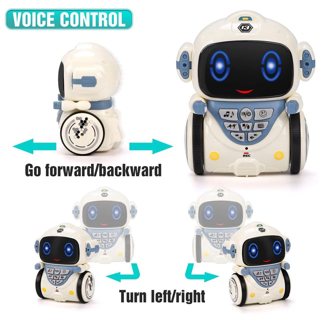• 【Commande vocale】Ce robot est si intelligent qu’il comprend vos commandes vocales et y répond. En mode de commande vocale, il peut recevoir 14 commandes vocales spécifiques telles que « Chante une chanson. Raconte une histoire. D’où viens-tu ?… ». Le robot répondra par une voix robotique et effectuera des actions.