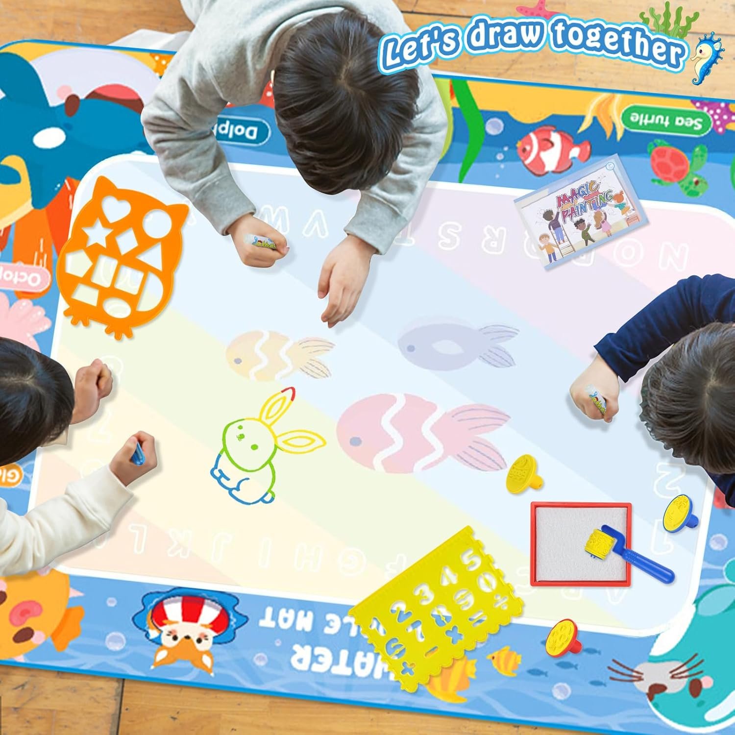 إبداع بلا حدود (بدون بقع): يعمل الأقلام بالماء العادي فقط؛ لا حاجة للحبر أو المواد الكيميائية. إذا رسم الطفل على ملابسه أو على السجاد، لن يترك أي أثر، مما يعني راحة بال كاملة للأمهات.مساحة رسم عملاقة (100×80 سم): حجم كبير جداً يسمح لعدة أطفال بالرسم معاً في نفس الوقت، مما يشجع على اللعب الجماعي والمشاركة.طقم إبداعي متكامل (24 قطعة): لا يقتصر الأمر على الأقلام فقط، بل يضم الطقم:سحر الاختفاء التلقائي: بعد حوالي 5 إلى 10 دقائق (حسب درجة الحرارة)، تجف المياه وتختفي الرسومات، مما يجعل البساط قابلاً للاستخدام آلاف المرات دون الحاجة لورق جديد.مواد آمنة وصديقة للبيئة: مصنوع من البوليستر عالي الجودة مع طبقة خلفية من PVC المقاوم للماء، مما يمنع تسرب الماء إلى الأرضية.مثالي للتطور المبكر: يساعد الأطفال من سن سنة واحدة فما فوق على تطوير التنسيق بين اليد والعين، التعرف على الألوان والأشكال، وتعزيز مهاراتهم الفنية.المواصفات التقنية :الأبعاد 60 سم × 50 سم.المواد بوليستر ناعم + قاعدة عازلة للماء.العمر المناسب من سنة إلى 6 سنوات.طريقة العمل املأ القلم بالماء وابدأ الرسم فوراً!2 أقلام مائية سحرية بأحجام مختلفة.16 قالب بأشكال متنوعة (حيوانات، نباتات، أرقام).أختام ورولر (Roller) لإضافة لمسات فنية ممتعة.دفتر تعليمي لمساعدة الطفل على تعلم خطوات الرسم الأولى.