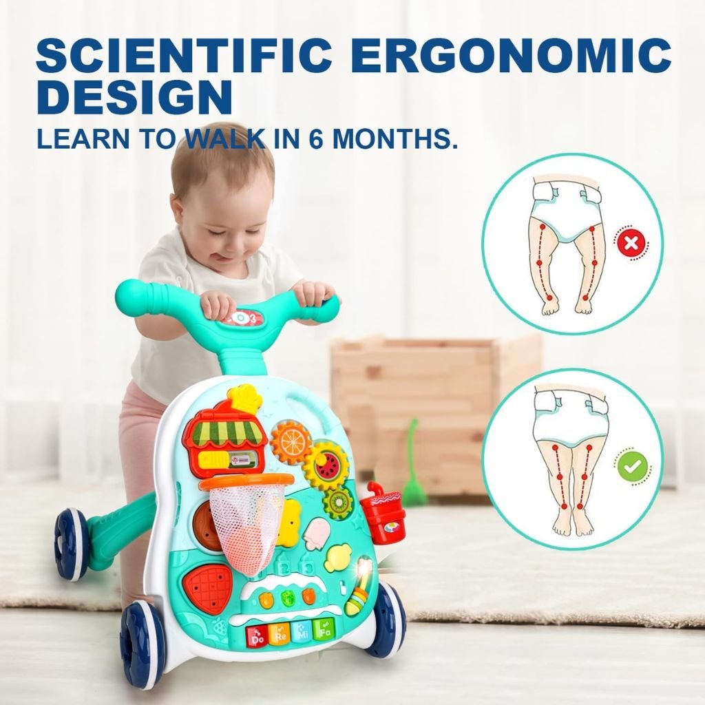 - Design 4 en 1 : Ce trotteur évolutif accompagne votre bébé dans son développement, passant de la position assise à la marche, tout en offrant des activités ludiques.